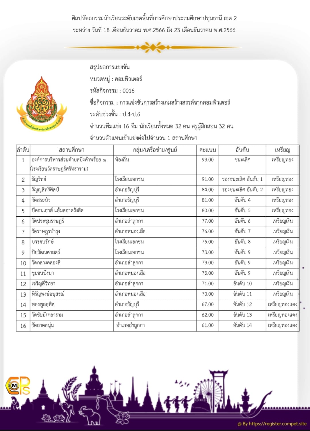 | 5 | ทอง รองชนะเลิศอันดับที่ 1 การแข่งขันการสร้างเกมสร้างสรรค์จากคอมพิวเตอร์ ม.4-ม.6 | 1. นายณัชภัทร เรืองสง่า | สำนักงานเขตพื้นที่การศึกษามัธยมศึกษาปทุมธานี กลุ่ม 2 |
